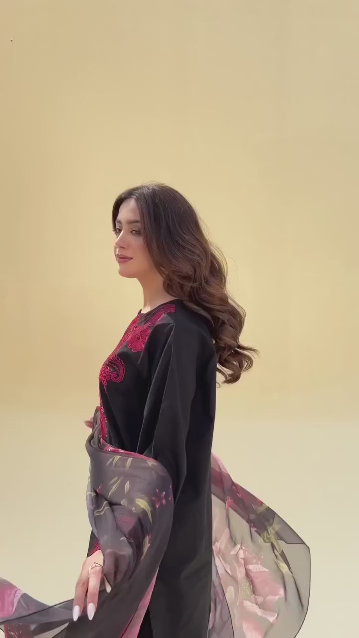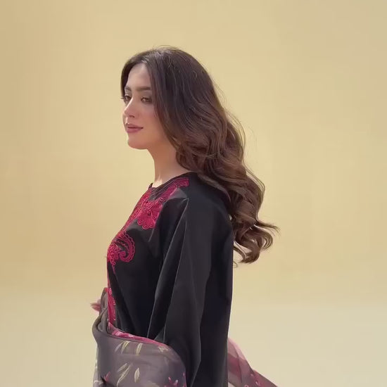 Noir Blossom is a refined black ensemble accentuated with intricate deep-red embroidery on the neckline and sleeves. Paired with tailored trousers and a flowing floral chiffon dupatta, this suit brings together elegance and contemporary charm—ideal for evening gatherings, festive wear, and statement styling.