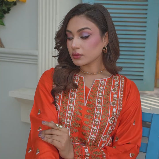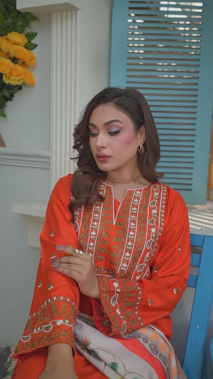 Sahara Rust is a timeless 3-piece pret ensemble crafted in a warm rust hue, beautifully adorned with subtle embroidery on the neckline and sleeves. The straight-cut shirt is paired with a matching printed trouser, while the statement printed dupatta adds depth with earthy tones and traditional motifs. This outfit blends cultural elegance with modern comfort, making it perfect for festive days, family gatherings, and graceful everyday wear.