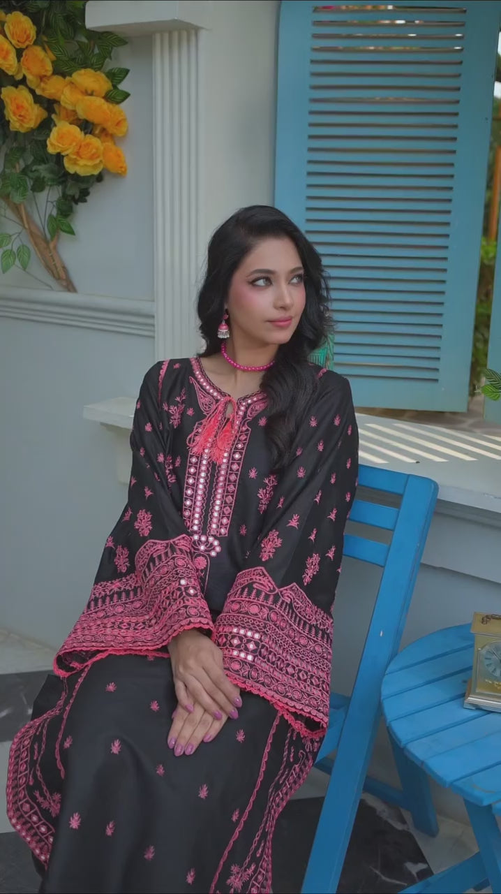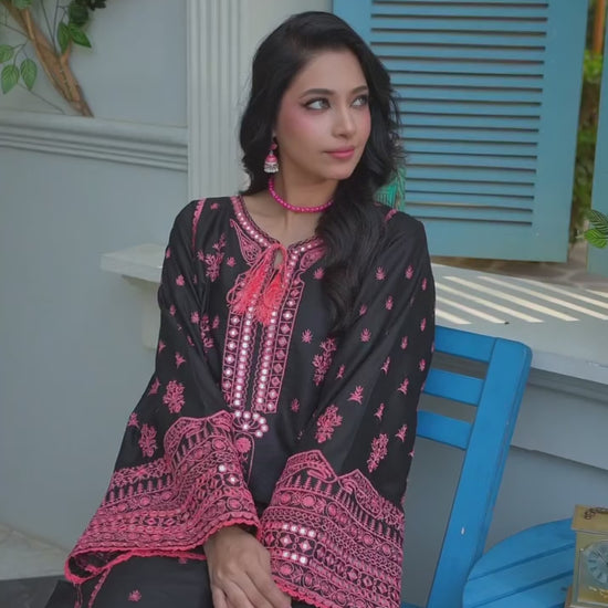 Zeenat Noir is a striking black 2-piece set highlighted with intricate pink embroidery across the neckline, sleeves, and borders. The beautifully detailed kurta is paired with a matching straight trouser, creating a perfect blend of bold contrast and graceful design. Ideal for festive occasions, evening wear, and formal gatherings, this outfit is crafted for women who love statement elegance with a modern ethnic touch.